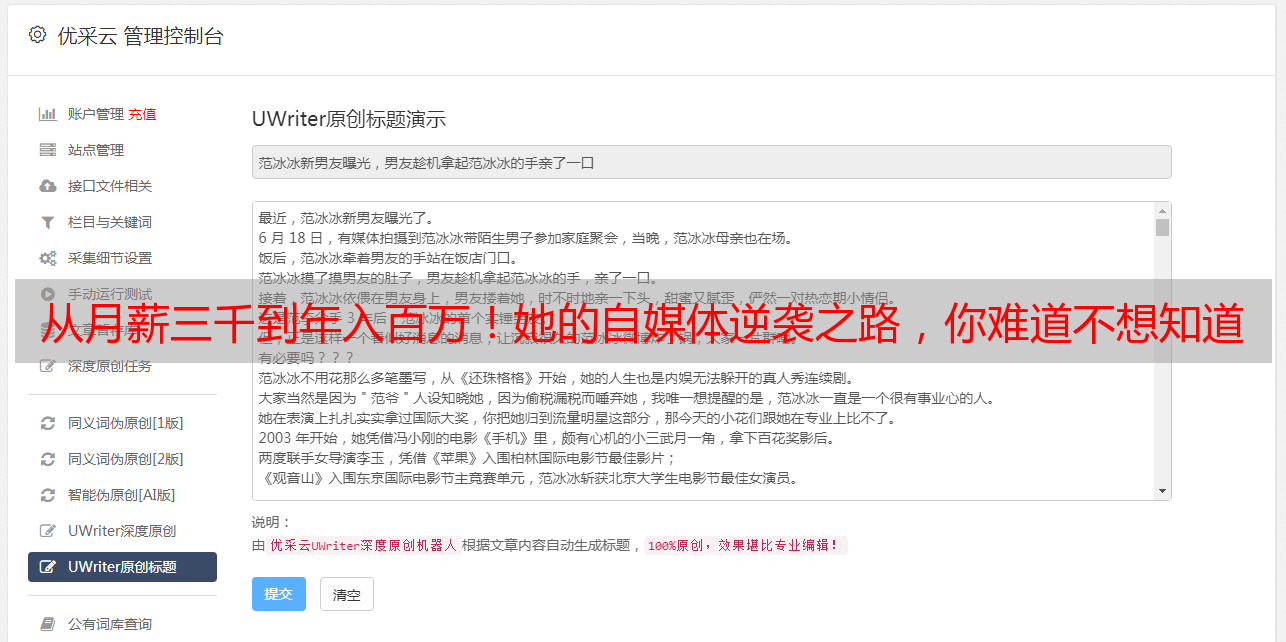 她借助优采云的热点植入功能,她运用优采云的自动配图功能,凭借这些,她保证每一篇文章都具备时效性,她保证每一篇文章都拥有视觉吸引力。