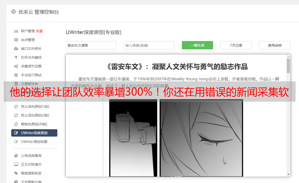 比如使用优采云的深度原创系统,在采集的基础上生成原创内容。