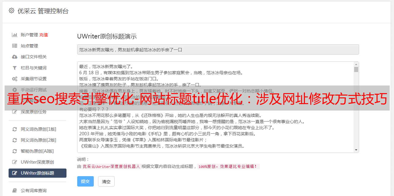 优采云 发布时间: 2021-07-01 06:27重庆seo搜索引擎优化-网站标题title优化:涉及网址修改方式技巧