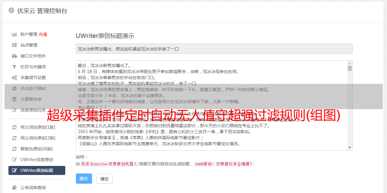 伪原创带有自定义库,完全适合站长个人使用。这与采集software 不同。注意演示站没有提供强大的采集过滤功能,这使得采集的代码更加简洁规范。保留 SEO 和前端样式定义。手动采集功能自动结合手动更人性化 3 蓝锂自动采集插件支持什么内容采集普通内容*敏*感*词*户版为例进行演示。更多在线演示请到蓝锂官方网站演示中心查看。找文章采集太简单了。我们以新浪国内新闻的采集为例。 采集Rules 准备标题规则内容规则入库规则看具体方法文中说明我这里只是为了演示整个规则编写过程的每一步