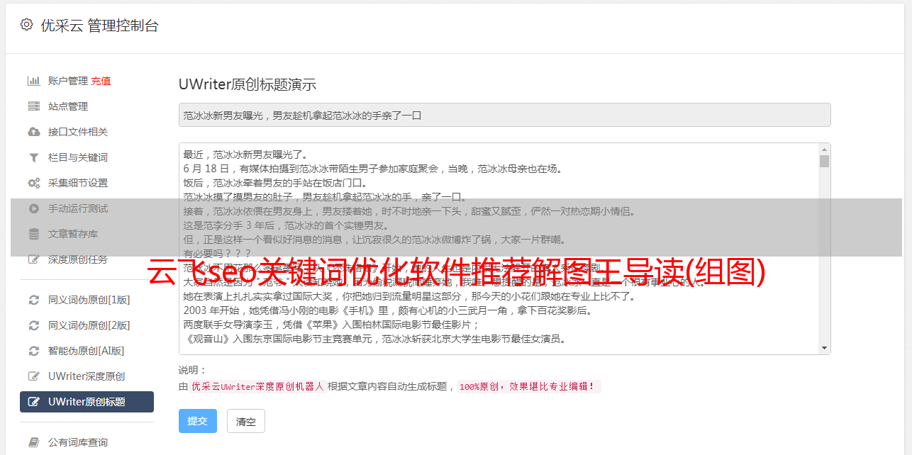 可根据后台设置的优化模板自动生成全站真实HTML页面,大大降低访问压力,提高优化效果。各大搜索引擎最喜欢的是静态页面,所以大量的真实页面让搜索引擎很赞收录3多套模板替换软件自带三套优化模板。所有页面都可以通过模板进行编辑。您可以将其修改为您以后需要的模板。您还可以向模板添加广告代码。它非常方便和灵活。近期我们会制作更多模板供大家选择~ 可以添加统计、广告等 4款强大的关键词采集功能软件自带一套关键词采集系统 我们已经破解了百度词典每次搜索可以轻松抓取100个关键词~1100个页面,同时自定义系统配置采集系统让您进行关键词采集从而为搜索引擎推导出数千个真实页面收录带来巨大的真实流量 5 强大的重新编辑功能 轻舞互联网SEO软件可以根据系统采集的原文自动添加随机句子和段落。根据设置关键词密度,在原文中均匀插入相关@。 k5@使日常文章看起来像原创文章,所有这些都是由系统自动完成的。 6 强大的防破解功能。青武互联网SEO软件采用原版SEO关键词界面。任何破解软件即使破解了软件也无法使用。软件可随时更换为轻舞SEO。界面或者词库破解软件绝对没有意义。 7 简易广告词生成文件为了达到更好的推广效果,本软件只要输入网站地址即可设置生成广告文件。可以轻松生成带有广告的网站,可以跳转到可以弹出的漂亮站点,8个强大的傻瓜式建站功能,没有网站制作经验的人,只要懂打字,他们可以轻松转换网站制作和soft有非常详细的视频教程,完善的使用方法,清晰的使用步骤,轻松搞定需要的关键词你需要推广到各大搜索引擎的收录并获得一个巨大的关键词流三冰点seo关键词优化软件1 真的是自动的~你要做的就是设置一个关键词告诉软件你的网站location其他任务由系统输入关键词系统自动完成会自动优化你的网站2输入关键词,系统会自动生成相关关键词并自动抓取相关文章以便你进行关键词采集从而导出数十万真实页面让搜索引擎收录带来巨大的真实流量。 3 根据关键词密度的设置,将相关的关键词均匀的插入到原文中,让每篇文章看起来都像原创文章,这一切都是系统自动完成的 4 不需要专业知识,只要懂打字,就可以轻松达到网站优化的目的,并且软件有非常详细的视频教程,完善的使用方法,清晰的使用步骤。可以获得一定的关键词,需要推广到百度谷歌前端,获得巨大的关键词流量