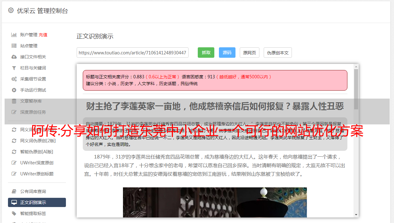详细采集以上数据,做详细的数据分析,让我们充分了解我们与对手的差距,以及我们网站的不足。这让我们的网站 优化方案更有说服力。