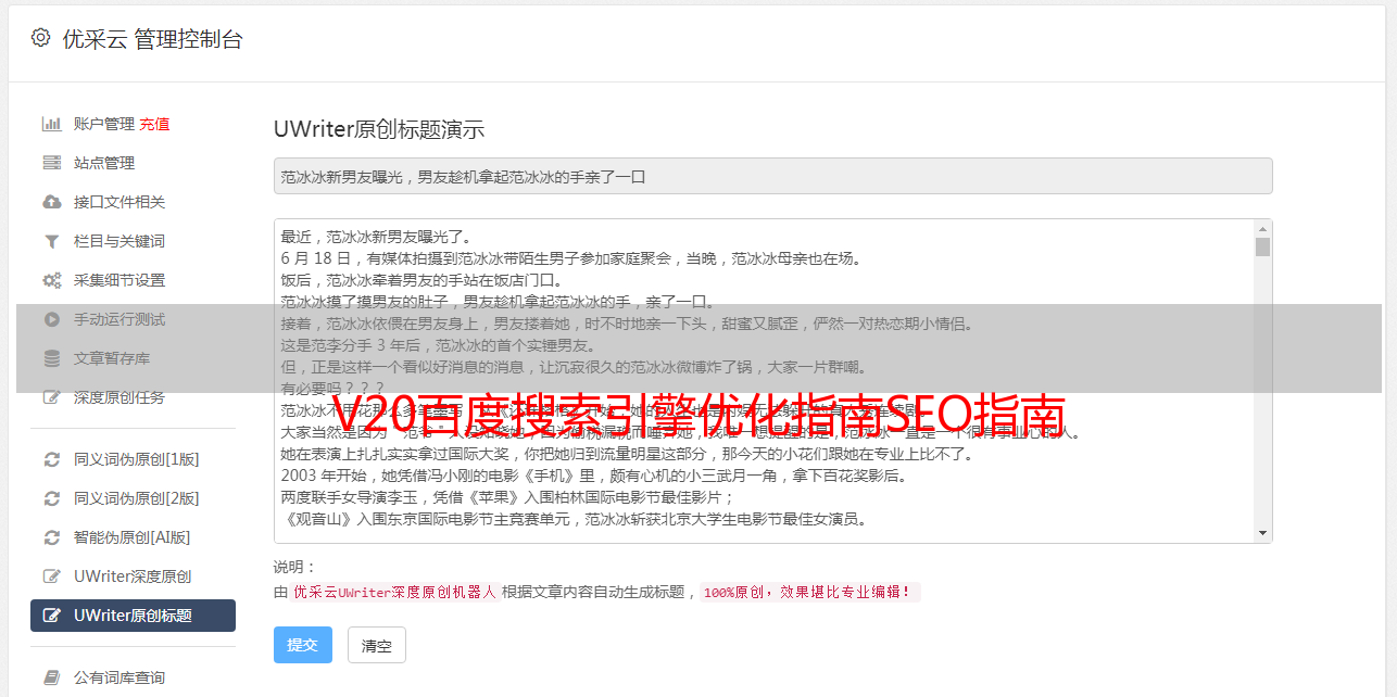 协议中返回码含义的定义设置。百度蜘蛛对常用http返回码的处理逻辑是这个404•404返回码的意思是NOTFOUND,百度会认为该网页无效,所以一般从搜索结果开始,短期内,蜘蛛再次找到这个网址,不会抓取 503•503 返回码。意思是ServiceUnavailable百度会认为网页暂时无法访问。通常网站temporary 关机。带宽受限等情况,网页返回就会出现这种情况。 503百度蜘蛛不会直接删除这个网址,短期内会再次访问。如果网页已经恢复,就可以正常抓取了。如果继续返回503,短期内会被多次访问。但是如果网页长时间返回503,这个url还是会被百度认为是断链,从搜索结果中删除。 网站construction 搜索引擎SEO指南 我的indd949AM 百度搜索引擎优化指南 18 建议如果网站暂时关闭,网页打不开时不要立即返回 • 404 建议使用 503 状态 503 OK 通知百度蜘蛛,页面暂时不可用,请稍后再试。如果百度蜘蛛爬你的网站压力太大,请尽量不要使用。 404也建议返回503,让百度蜘蛛过一段时间再尝试抓取这个链接,如果当时网站空闲,就可以成功抓取。有一些网站想百度only收录部分内容,比如审核后的内容,积累了一段时间的新用户页面等,这种情况建议发新的内容。暂时返回403等进行审核或处理,然后恢复正常状态。网站迁移或域名更换时请使用301返回码。 403•403返回码的含义是Forbidden 百度会认为该网页当前被禁止。在这种情况下,如果它是一个新发现的 url。百度蜘蛛暂时不会被抓取。将在短期内再次检查。如果是百度有收录url,则不会直接删除。短期内将再次访问相同的内容。如果允许访问该网页,则将正常抓取该网页。短时间内,访问会重复多次,但如果网页长时间返回403,百度也会认为是断链。从搜索结果中删除 301•301 返回码。建议在重定位域名和更改站点改版时使用301返回码,以尽量减少改版带来的流量损失。虽然百度蜘蛛现在对 301 重定向的响应周期很长,但我们仍然建议您这样做。 SEO指南 我的indd950AM19排名靠前的封面 网页主要内容的标题,用来告诉用户和搜索引擎这个网页的主要内容是什么。搜索引擎在判断网页内容的权重时,标题是主要的参考信息之一。网页标题是网页主要内容的摘要。搜索引擎可以通过网页的标题快速确定网页的主题。每个网页的内容都不一样。每个网页都应该有一个唯一的标题。我们建议通常网页标题可以这样描述主页网站名称或网站名_提供服务介绍或产品介绍•频道页面频道名称_网站名•文章页文章title_频道名称_网站名•title 指的是html文档中的title标签非文章titles以如下形式放置在html文档的head标签中。推荐做法。每个网页都应该有一个唯一的标题。不要使用所有页面。使用默认标题。标题必须清楚地收录页面中最重要的部分。内容•简洁明了,不列出与网页内容无关的信息•用户浏览通常是从左到右。重要的内容应该放在标题的顶部•使用用户熟悉的语言来描述它。如果你有中英文网站名•称 尽量使用用户所知道的作为标题描述。 网站建SEO 搜索引擎指南 my indd950AM 百度搜索引擎优化指南 20条好内容建设网站内容建筑以服务网站核心价值观主要提供给搜索引擎收录•也应该对他们有帮助核心价值。内容建设要符合网站的主题,比如你的网站是一个it新闻网站只是不要放一堆漂亮的图片对网站的核心价值没有帮助,除了浪费服务器资源。看到美图的人不会对它的新闻感兴趣。 网站的内容应该是一个面向用户的搜索引擎只是网站访问者提供满足用户需求的原创内容很重要。编写锚文本。锚文本是指制作链接时使用的描述文本。它用于告诉用户该链接已链接到网页。很明显,用户越容易理解指向网页的内容。用户与您的网页的联系始于指向其他网页的链接。这个链接的描述能否让用户明白吸引用户访问的重要性?就像普通用户一样,我刚刚在搜索引擎中发现了一个新的。网页的锚文本也是该网页描述的唯一参考因素。将 alt 描述添加到图片中。当网速较慢时,无法显示图片,让用户了解图片传达的信息,搜索引擎可以了解图片的内容。资源更丰富 可以以专题等更丰富的内容组织形式提供内容。以最低的成本为用户提供所需的全部信息。一个sns网站注册用户是它最重要的资源,它主要依靠搜索来吸引新的注册用户。引擎中的姓名搜索是潜在新用户的重要来源。他们提供给搜索引擎收录的注册用户名资源,可以引导搜索引擎用户转化为其注册用户。 SEO指南我的indd250AM21Web20类型网站应充分利用自己的优势,让用户通过投票、评论等方式自行判断资源的好坏。 These quality judgments may also be used by search engines to judge the value of resources. Manage well web20 and other user-generated content products if they are used by cheaters • Possibility to affect the weight of the entire site. The video quality of a video site is usually higher. Users can refer to the voting information to reduce the cost of screening and win the recommendation of 网站. 网站有 on the Internet providing the same content service When the content is the same, which 网站 will be ranked in front of the search engine? The decisive factor is the recommendation. The hyperlink we often say is a kind of recommendation. When the content on your 网站 is useful to the user, the user will recommend it to others. The form of recommendation may be various. Send to your friends on instant messaging tools. Repost and recommend in the forums you often soak. Write 