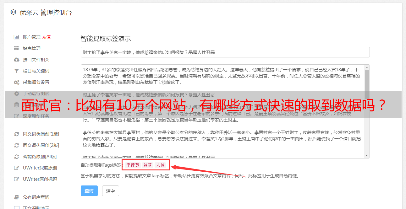 同时,可能因为业务的须要,比如智能推荐等,需要我们对网站进行一些预处理(比如打标签)。此时,一个网站管理系统将是必须的。