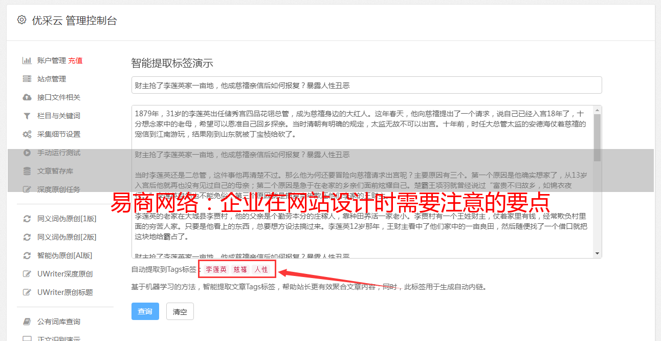 网站 的特性很重要。只有了解客户的消费习惯,才能在市场上站稳脚跟。因此网站construction应根据公司市场定位结果进行调整,明确公司产品,确定服务目标。 网站建设参考业界优质网站,将网站的服务功能扩展到极限。每当搜索引擎发现超过5个一般文章,他就会选择放弃。后一点是网站的页面链接一定要适度。在网站 规划中,用户体验良好的平衡。为什么要优化网站? 网站使用户不会在网站过程中迷失方向,可以轻松返回网站等相关内容页面。 网站解决了网站中洛易的用户体验,网站让用户继续是根本。 网站精心策划,可以将网站的内容和产品尽可能的展示在用户面前。合理的网站可以增加用户粘性。提高网站的深度,增加PV,降低网站的跳出率。清晰大方的网站更容易获得用户的好感,提高网站的回访率。简洁网站,搜索引擎可以把网站抓到极限,然后加上网站的输入。如何优化网站?主栏的结构和标题要清晰。首先要明确内页的操作和间隔。