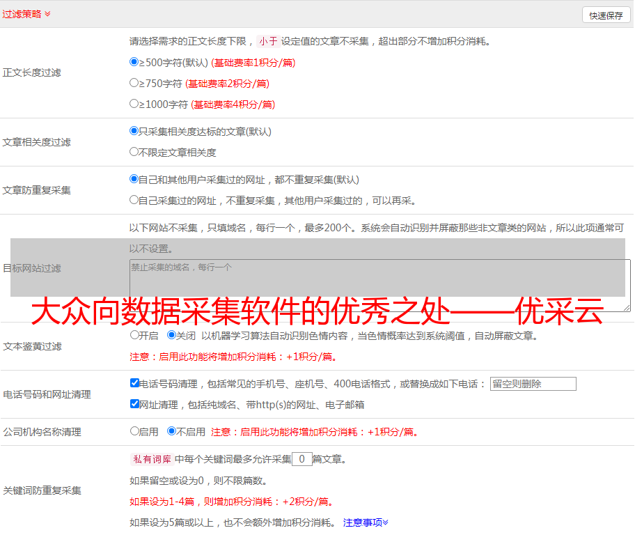 相比之下优采云采集器提供了更多的功能:强大的过滤配置、完备的常规功能和全面的文字处理配置。当然,强大的功能也增加了复杂度,所以你需要有更多的耐心去学习和使用。