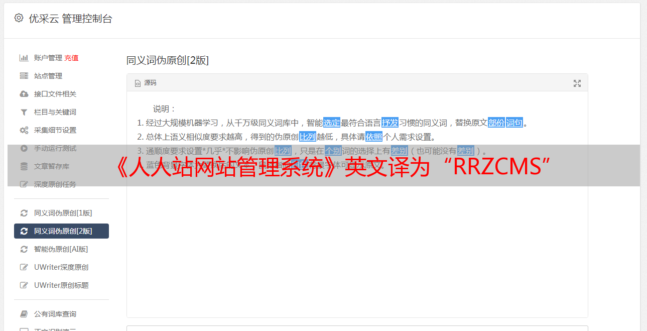 优采云 发布时间: 2021-07-12 01:11《人人站网站管理系统》英文译为“RRZCMS”