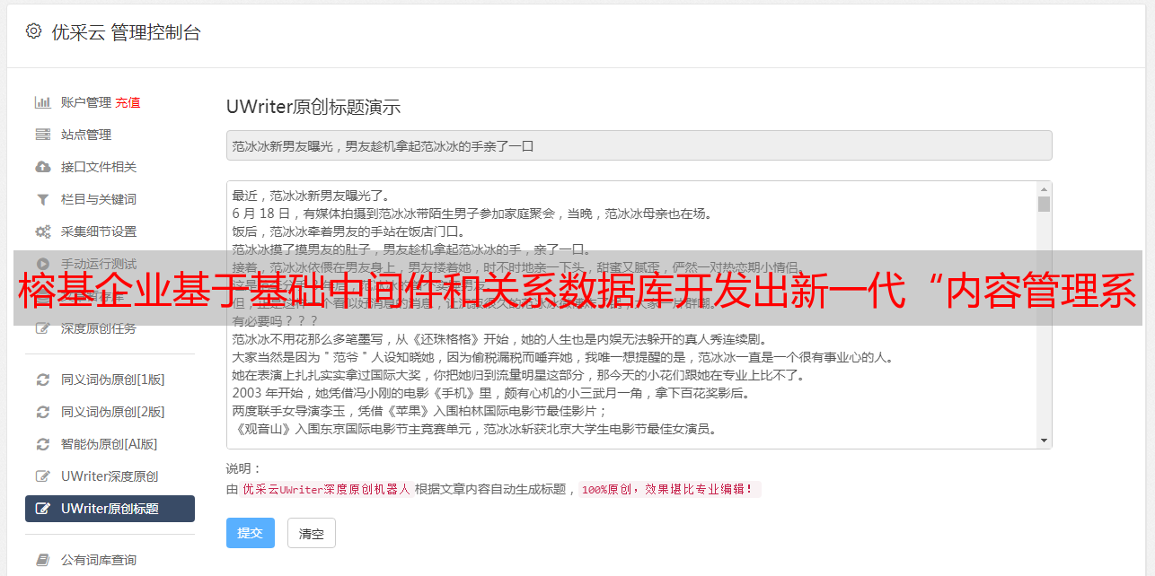 优采云 发布时间: 2021-07-13 20:04榕基企业基于基础中间件和关系数据库开发出新一代“内容管理系统”产品