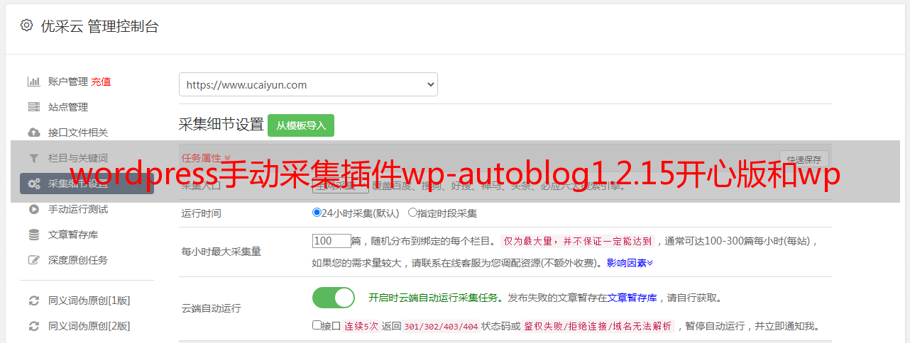 基本设置功能齐全,完美支持Wordpress各类功能,可手动设置分类目录、标签、摘要、特*敏*感*词*片、自定义栏目等;也可采集目标网站的分类目录、标签等信息后,可手动生成并添加相应分类目录、标签等信息