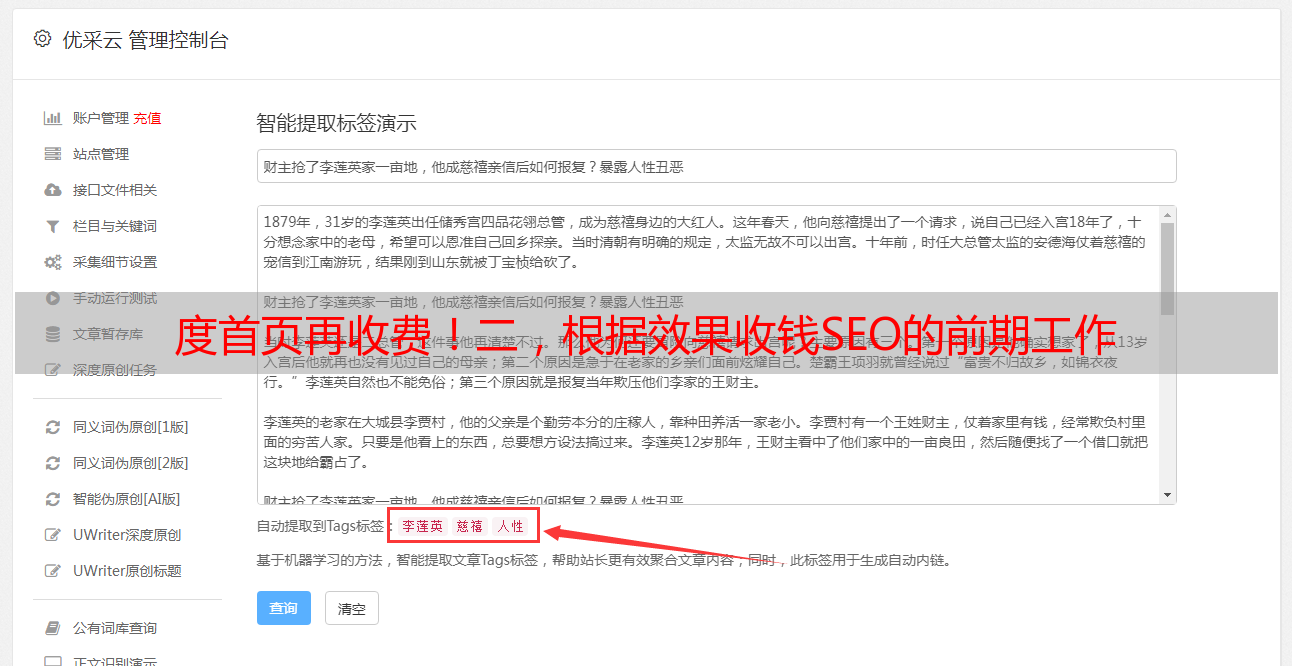 优采云 发布时间: 2021-07-16 03:26度首页再收费!二,根据效果收钱SEO的前期工作
