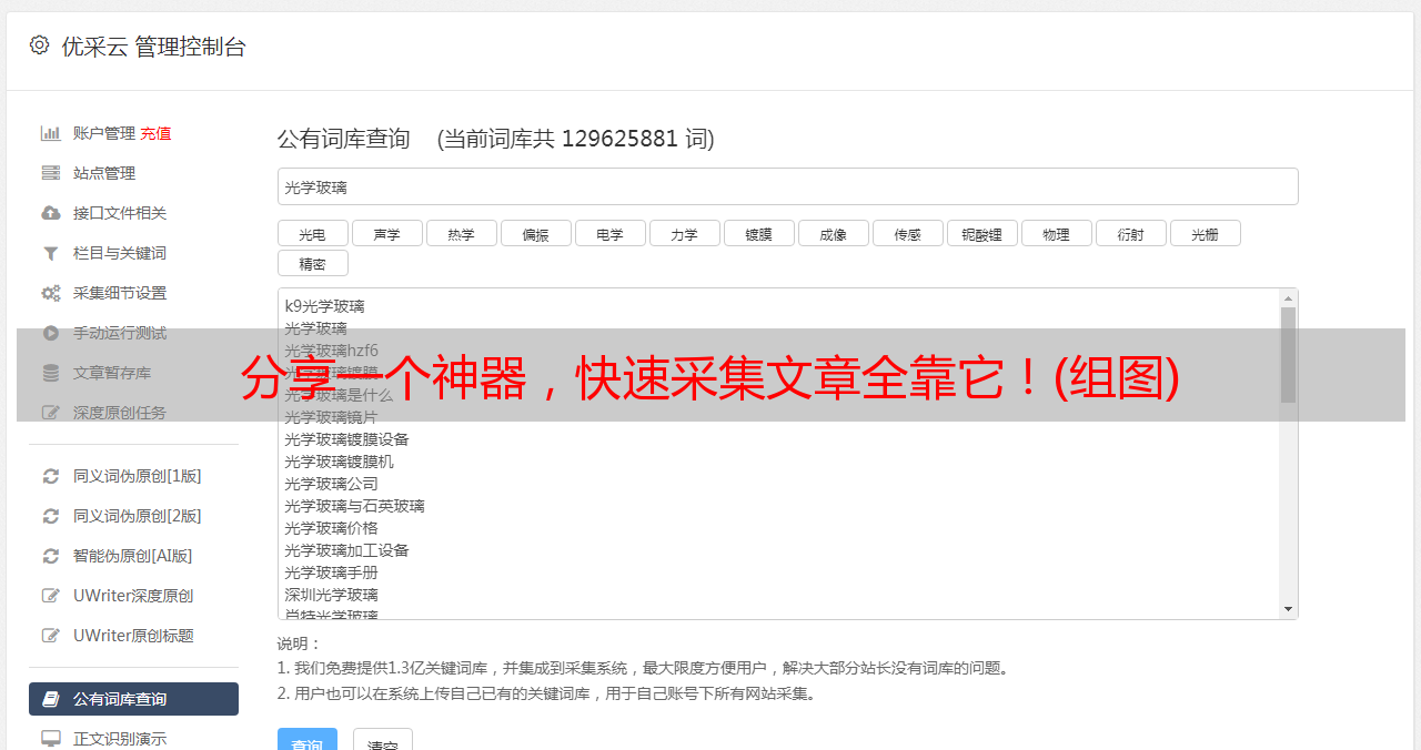 优采云采集是自媒体材料搜、文章原创的运营工具,一键发布,有效提升新媒体运营效率,降低企业成本。