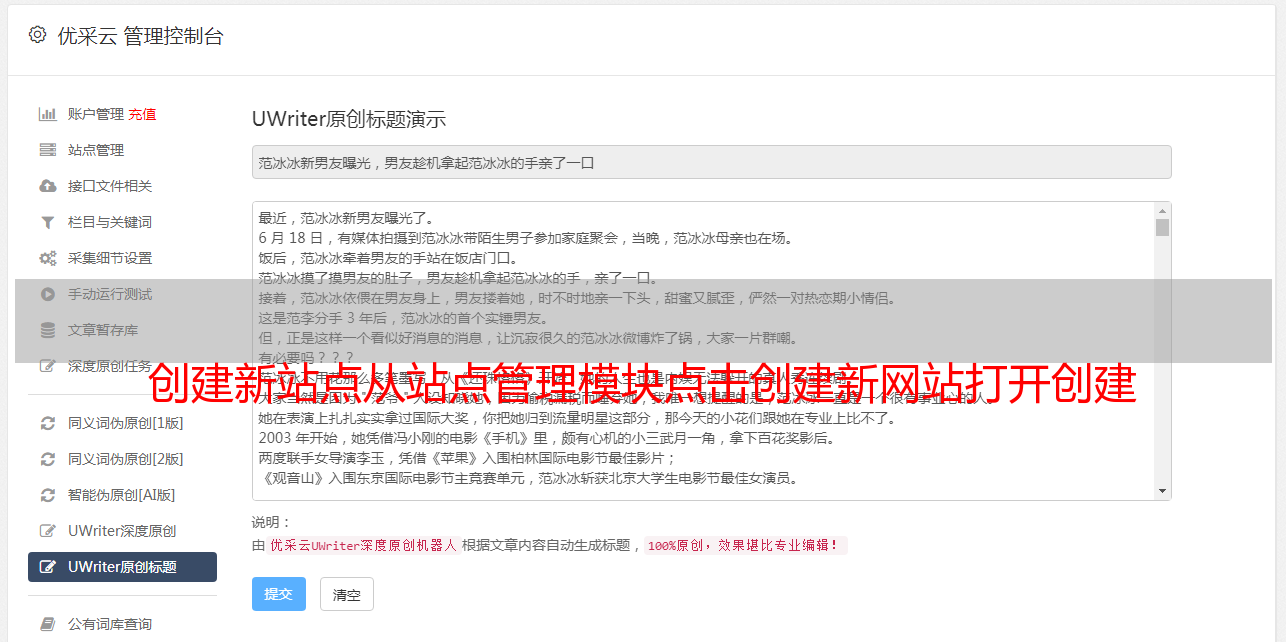 所有下级栏目和栏目下的所有内容将同时删除,无法恢复。请谨慎操作。 4 合并当前列将当前列合并到某一列下。所有下级栏目和栏目内容也会同时合并到指定栏目下,并且无法恢复,请谨慎使用。要合并的列必须存在且不能合并到其从属列。将列合并到指定列的操作如下图所示。将当前列合并到指定列的*敏*感*词*如下图所示。合并当前列和列合并的操作是不同的。将一列移到另一列将保留其原有的父子关系,此操作可以在用户被指定对某列具有管理权限时恢复6个指定列权限同时,也自动拥有其管理权限低级列。当您为某一列指定权限时,选择替换子列权限将清除下级列的所有原创权限设置,并自动继承当前指定权限列的权限。共有三种类型的权限,包括读取、创建和管理。可以指定读取和新权限。管理权限必须分配给个人。具体说明请参考页面帮助。系统管理员、单元管理员和站点管理员用户不需要指定列权限。这些用户自动拥有所有列的管理权限。列权限界面如下图所示。三内容管理内容管理包括新建、修改、删除、审核、推荐、移动附件管理和评论管理、创建和修改,使用FCKEditor作为在线编辑器,支持在编辑文章内容时添加附件内容,审核确定content 是否可以在网站前台显示内容的推荐值,决定了内容在显示时的顺序。未指定推荐值。默认内容按发布顺序显示。此举是将现有内容转移到新列。如果在移动时指定不清除原列下的内容,则此操作相当于共享。 1 新建 从顶部导航菜单中选择网站管理--内容管理。从左侧选择新建内容栏,在右侧管理页面点击新建。此方法适用于用户。具有栏目管理权限的用户新建内容编辑模式包括文章Album视频链接四种模式