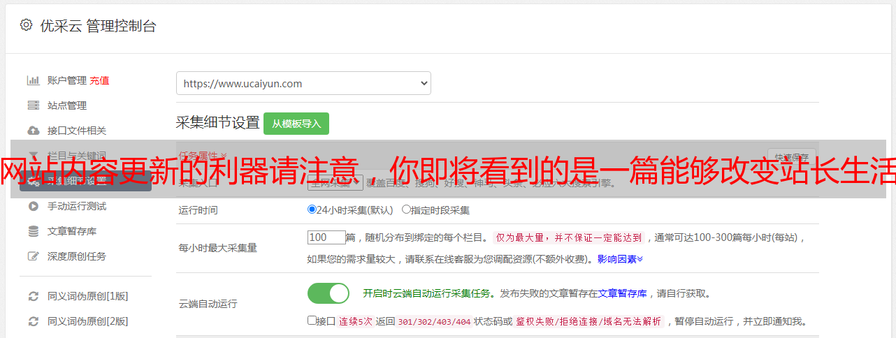 优采云 发布时间: 2021-07-20 23:20网站内容更新的利器请注意,你即将看到的是一篇能够改变站长生活和命运的文章