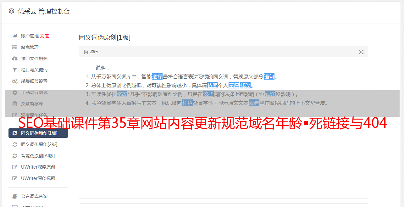 通过插入方法修改段落出现的顺序。例如,原创段落为12345,调整后的段落为54321或45213。 修改内容-词替换法 词替换法使用含义相似的词来替换原创内容中的词。比如今天下午,万里无云的心情也是多余的开朗,可以变成今天晴空万里的惬意午后。修改后的内容数字替换方法。数字代换法可以改变内容中的数字,比如原来的内容,造成1998年以来最大的洪水。可以改变,造成1998年以后最大的洪水灾害。比如原来的内容是卖100万张票就可以改为100万张售票伪原创Notes 代表词需要替换或修改,如地理位置、年龄、姓名、*敏*感*词*