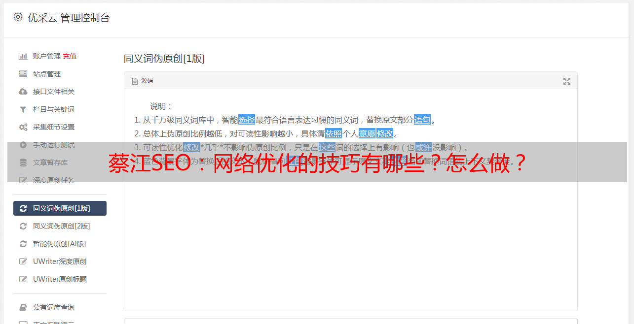 优采云 发布时间: 2021-07-25 00:04蔡江SEO:网络优化的技巧有哪些?怎么做?