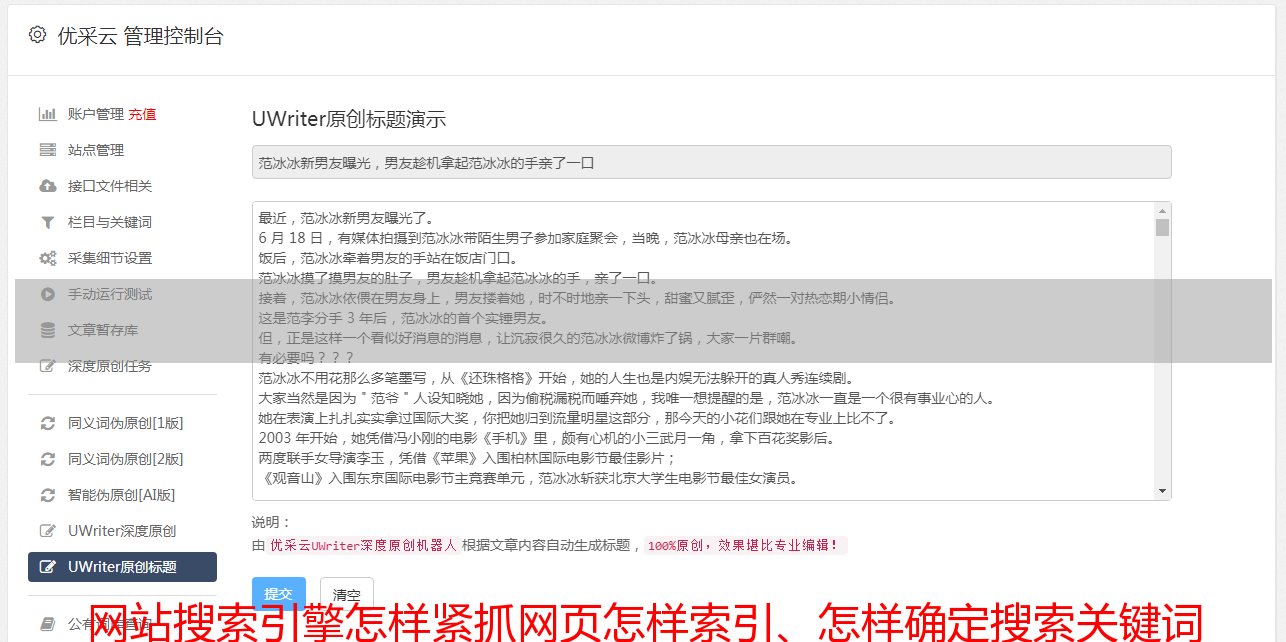 原创性的内容自然是百度收录的内容,因为百度鼓励原创。如果网站@大部分是纯采集和伪原创,就说明它是为搜索引擎生产的垃圾邮件,对搜索引擎非常不友好。如果生成的内容有价值,百度就可以了。如果内容拼接不可读,用户会反感。当然,这也是搜索引擎的错,是不正确的。的内容是提供给用户的,自然不会是收录你的网站@content,也不是收录,过几天就给你删了。 SEO网站@optimization---合理正规的网站@optimization会免费带来额外的营销。 网站@optimization 只要设计合理正规,在做项目的时候会给你带来免费的网站@推广、品牌营销、软文营销、博客营销、社区营销效果,而不仅仅是最终的关键词排名效果。这只是对任务完成情况的衡量。更重要的是,在实现这种效果的过程中,对网站本身的额外影响也是其他优化方式无法获得的收益。