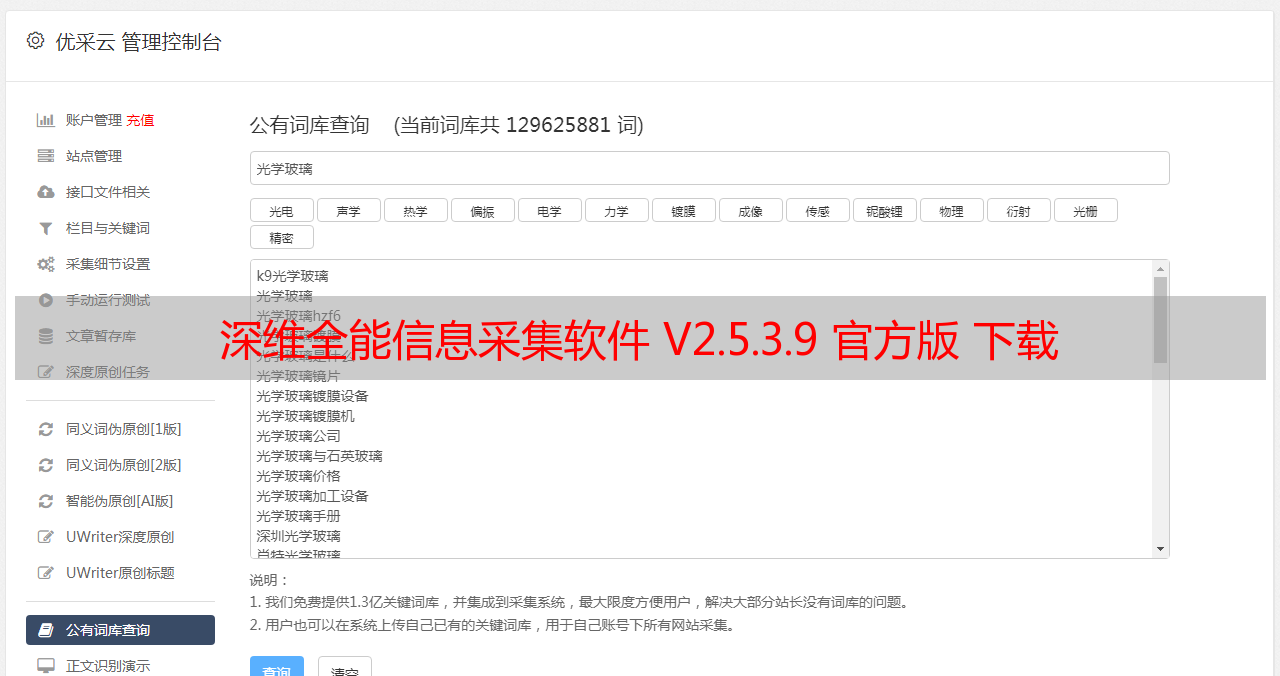 优采云 发布时间: 2020-08-10 13:19深维全能信息采集软件是一款用于采集网站信息的站长工具,采用交互式策略和机器学习算法,极大简化了配置操作,普通用户几分钟内即可学习把握。通过简单的配置,还可以将所采集网页中的非结构化文本数据保存为结构化的数据。