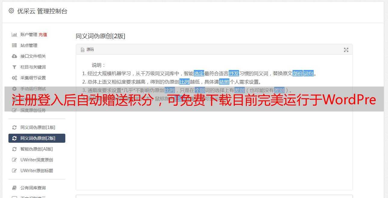 优采云 发布时间: 2021-07-29 18:04注册登入后自动赠送积分,可免费下载目前完美运行于WordPress各个版本