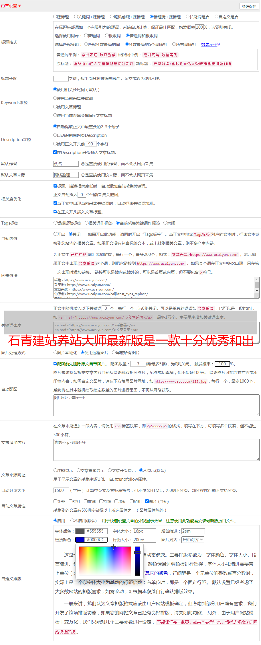 4、石青建站养站大师最新版可以设置自动外链和自动广告,当你的流量上来,轻松赚钱;