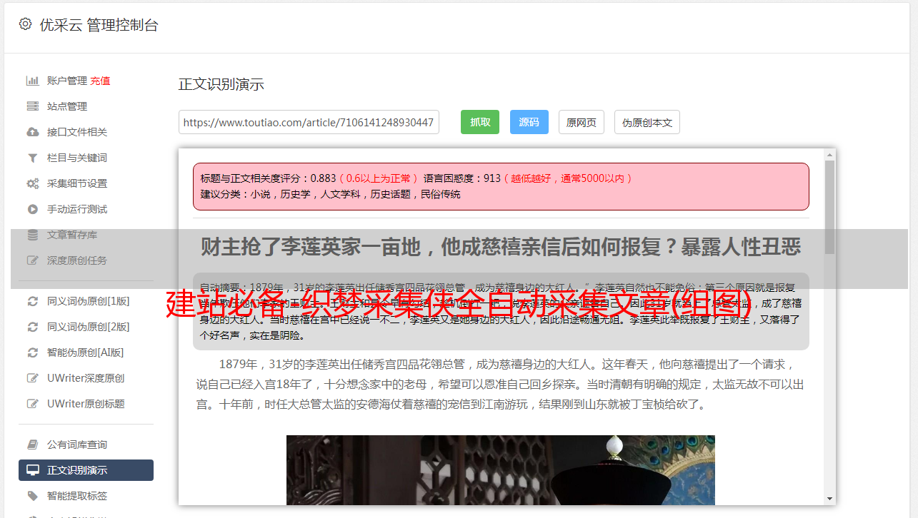 采集规则还可以针对采集5多个伪原创和优化方法提高收录率和排名,自动标题段落重新排列,高级混淆,自动内链内容过滤,URL过滤,同义词替换、插入seo词关键词添加链接等方式增强处理采集Back 文章采集文章原创性有利于搜索引擎优化提高搜索引擎收录网站权重和关键词排名6插件全自动采集无需人工干预织梦采集侠根据预设是采集任务按照设置采集方法采集URL然后自动抓取网页内容程序通过精确计算分析网页并丢弃不是文章内容页面的URL,提取优秀的文章内容,最后伪原创导入生成所有这些操作都是自动完成的,无需人工干预 7 人工发布文章也伪原创和搜索优化处理织梦采集侠不是只是一个采集插件,还有一个织梦 must伪原创和手动发布的搜索优化插件文章可以通过织梦采集夏的伪原创和搜索优化处理可以执行文章的同义词替换,并自动在链接中随机插入关键词链接和文章。 关键词会自动添加指定链接等功能是织梦必备插件8定期定量执行。 采集伪原创SEO 更新插件有两个触发器采集。一种是在页面中添加代码,由用户访问采集update 触发。另一种我们为商业用户提供的远程触发器采集服务新站可以定时量化,无需任何人访问采集update,无需人工干预