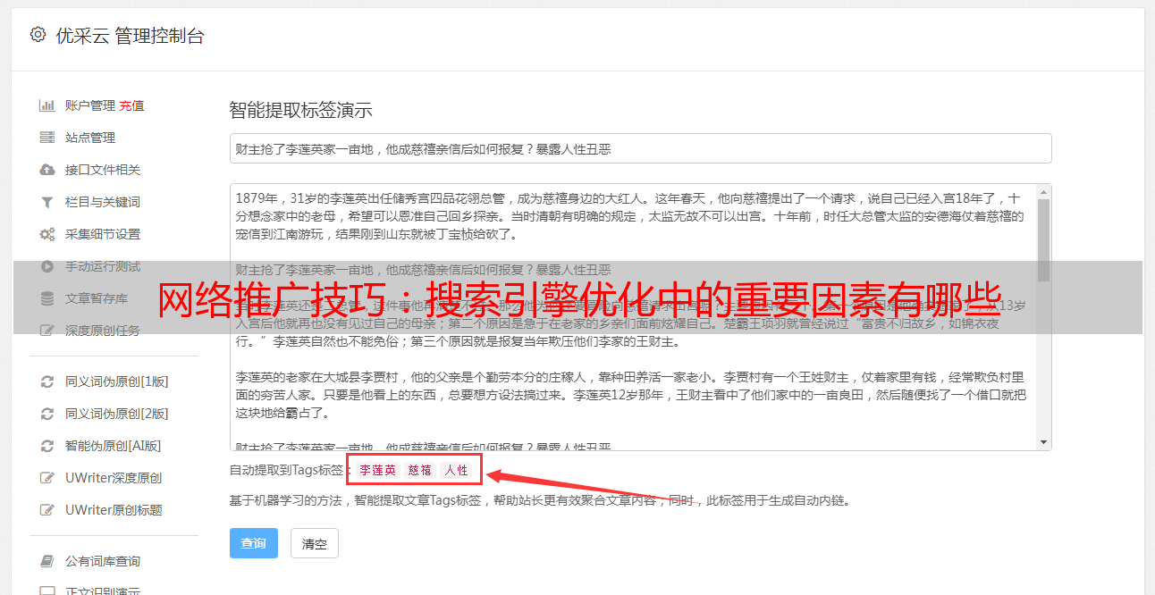 优采云 发布时间: 2021-08-01 19:37网络推广技巧:搜索引擎优化中的重要因素有哪些