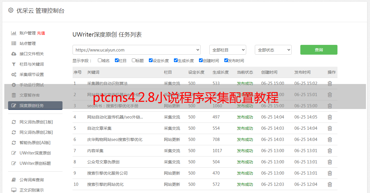 优采云 发布时间: 2020-08-11 00:46安装了ptcms4.2.8小说程序之后,很多小伙伴不知道如何配置采集教程,今天来介绍一下具体的采集方法。