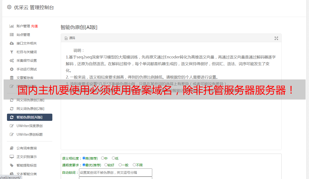 优采云 发布时间: 2021-08-04 19:22国内主机要使用必须使用备案域名,除非托管服务器服务器!