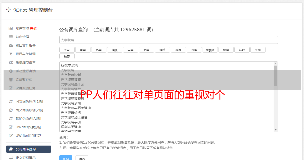 PP人往往对单个页面的关注度比对整个网站要少,但是一个页面有时也能达到整个网站无法达到的效果。单页有利有弊,优点是集中网站的权重有利于增加网站的相关性,有利于搜索引擎抓取。当然,也有缺点。如果要获得大量流量,内部优化比较困难。 关键词 的布局变得更加困难。如果要在单个页面上布局大量关键词,会被搜索引擎判断为关键词Stacking,导致过度优化。