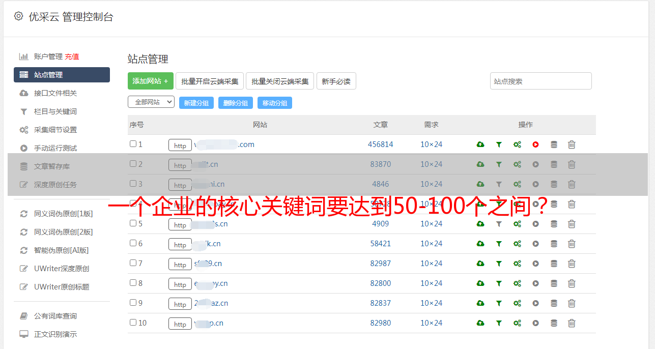 将扩展的***核心关键词分配给网站main导航的每一列。 网站的一个主导航一般有10列,每列分配3-5个关键词,所以消耗了50个关键词。剩下的词放在网站的二级列表页,或者三级详情页。每个页面使用1个关键词,这个关键词必须是长尾关键词。这是网站的结构优化。在网站结构优化过程中加入品牌词,完成网站品牌词优化。