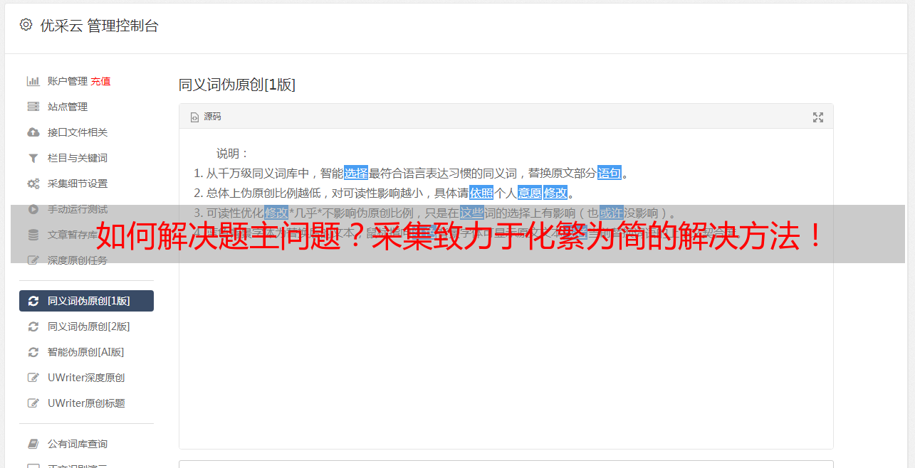 优采云采集致力于化繁为简,让数据触手可及,让更多人更轻松采集网上公开的数据,原来需要懂HTML和正则表达式的专业知识该工具经过简化,只要您了解基本的计算机操作,就可以使用通用工具。您只需要在网页的可视化操作界面上用鼠标点击需要的采集内容,即可轻松配置采集项。操作简单是优采云设计产品的原则,强大的功能和简单的操作是我们努力的目标。