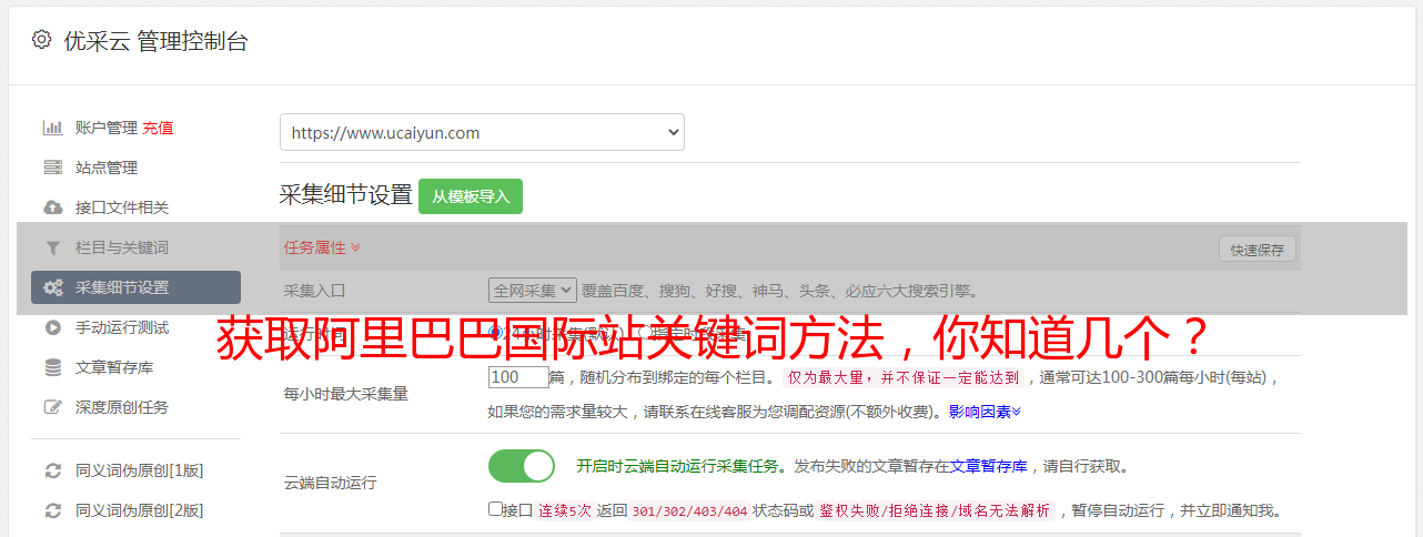 通过搜索栏下拉框采集阿里的热门关键词或长尾词。