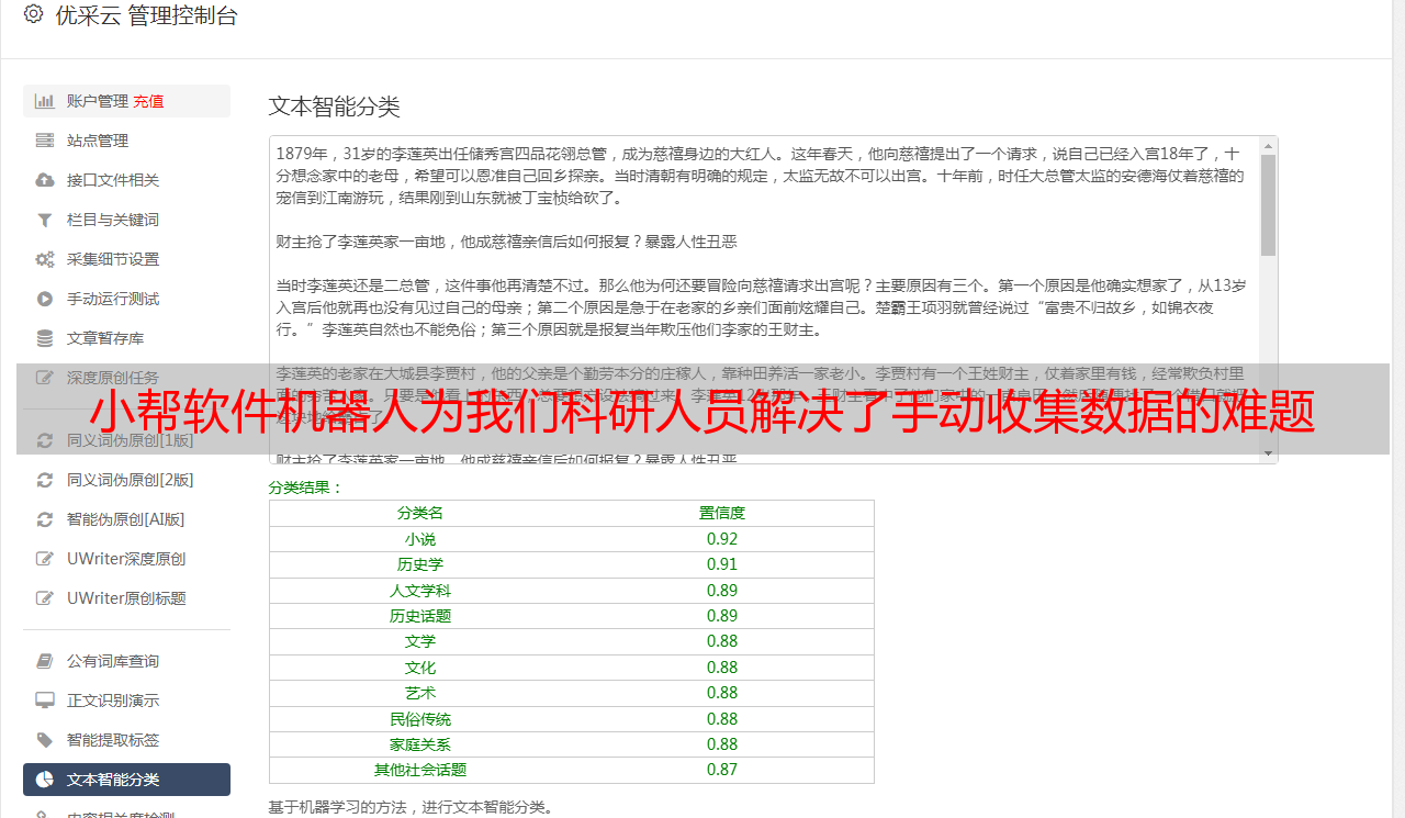 很长一段时间,我都饱受反复机械采集work的困扰。直到有一天,研究室的一位同事向我推荐了一款名为“小邦”的软件机器人。可自动进行搜索、复制、粘贴、下载等操作,并发布各个数据库中的论文、文档和实验数据采集。