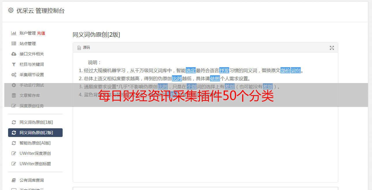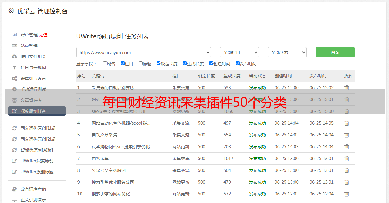 此插件可通过天人官方采集平台中转,来获取财经资讯的50多种分类下每晚更新的文章(旧文章不采集),也就是说可以获取全网海量实时更新的最新的文章。可配合手动采集插件实现全自动免维护更新网站的功能。