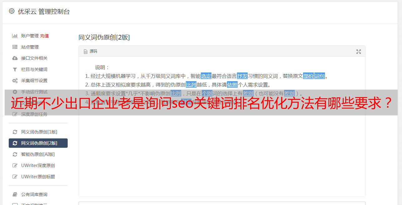 优采云 发布时间: 2021-08-14 19:22近期不少出口企业老是询问seo关键词排名优化方法有哪些要求?