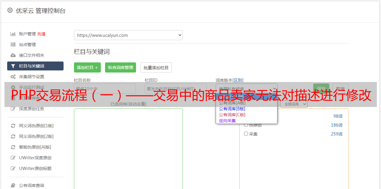 优采云 发布时间: 2021-08-14 21:17PHP交易流程(一)——交易中的商品卖家无法对描述进行修改
