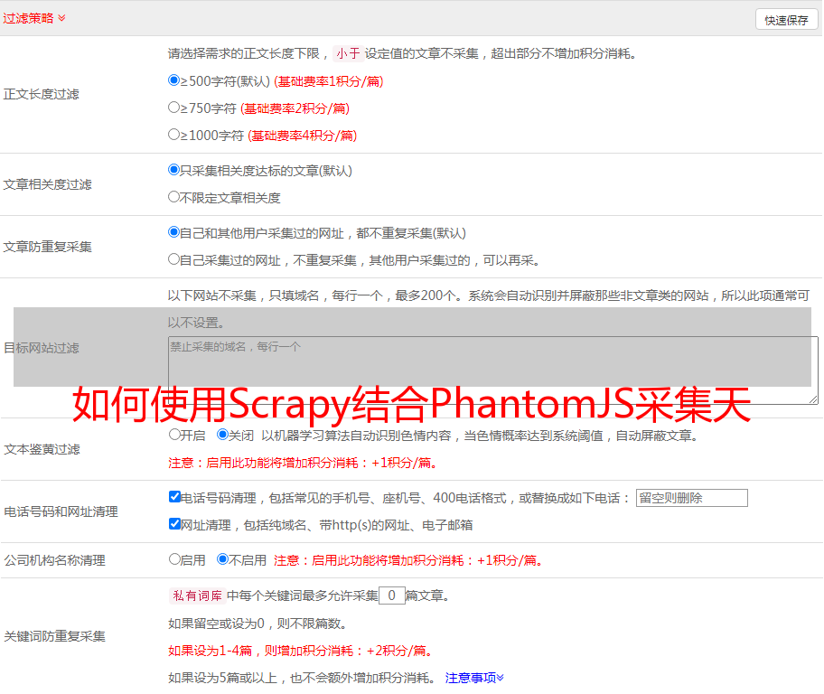 本文主要结合PhantomJS采集天猫品内容介绍如何使用Scrapy。文章中自定义了一个DOWNLOADER_MIDDLEWARES,使用采集动态网页内容需要加载js。看了很多关于DOWNLOADER_MIDDLEWARES的资料,总结起来,使用简单,但是会阻塞框架,所以性能不好。有资料提到自定义DOWNLOADER_HANDLER或者使用scrapyjs可以解决框架阻塞的问题。有兴趣的朋友可以去研究一下。我不会在这里谈论它。