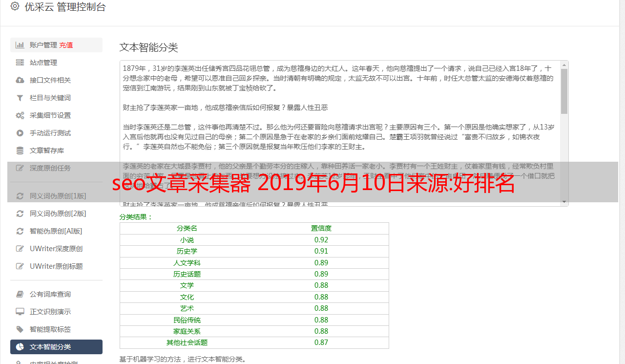 优采云 发布时间: 2021-08-15 19:17seo文章采集器 2019年6月10日来源:好排名