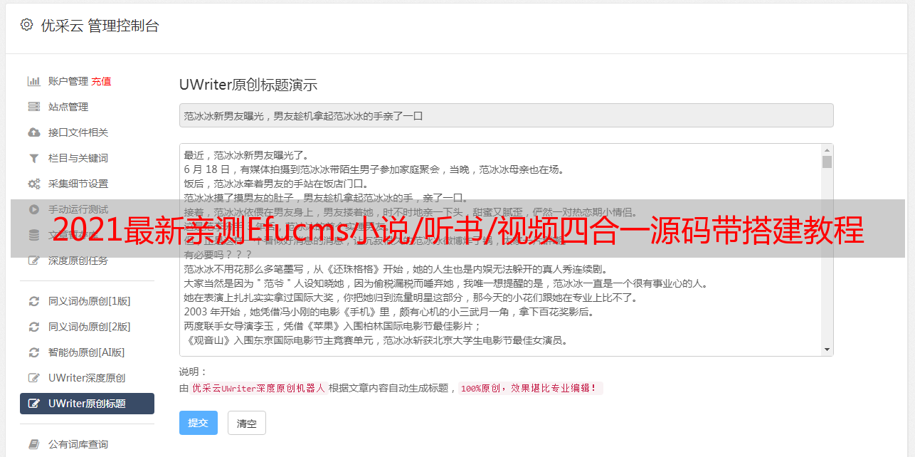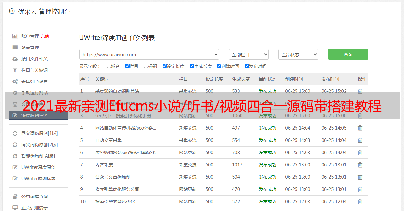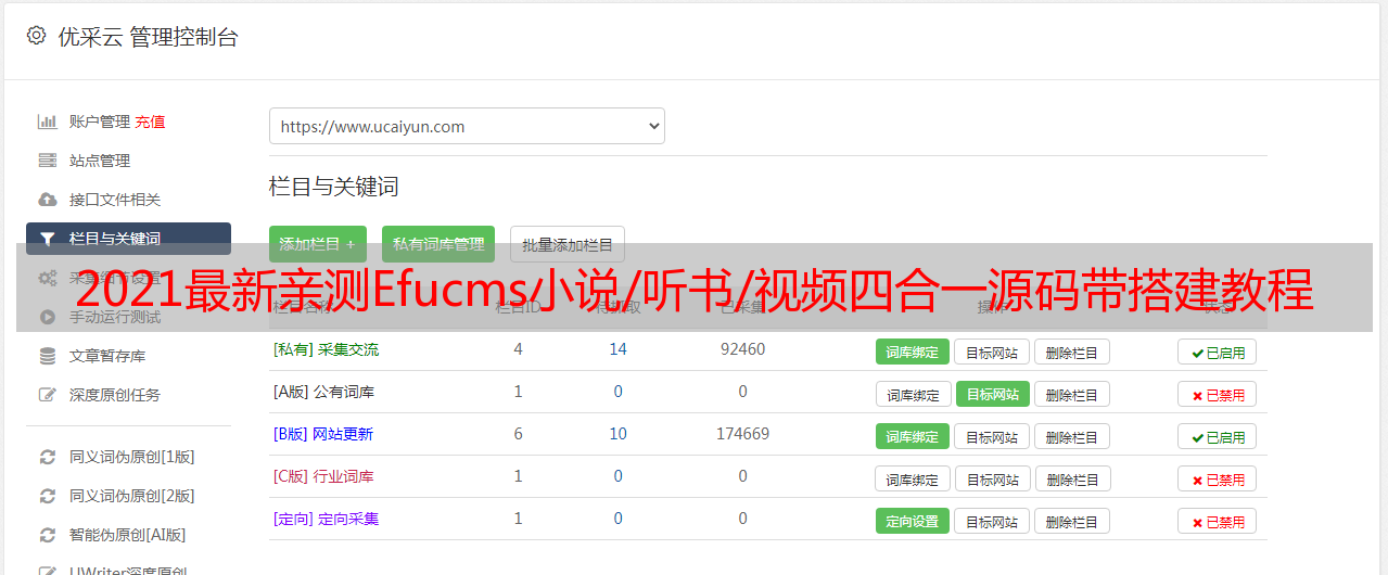 优采云 发布时间: 2021-08-18 04:022021最新亲测Efucms小说/听书/视频四合一源码带搭建教程+优采云采集这套源码