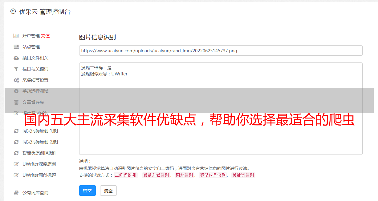 采集 功能齐全,不限于网页和内容,任何文件格式都可以下载。具有智能多重识别系统和可选的验证方法,以保护安全。支持PHP和C#插件扩展,方便数据的修改和处理。同义词替换、参数替换、伪原创必备技能结论:优采云适合编程高手,规则易写,软件定位更专业精准。