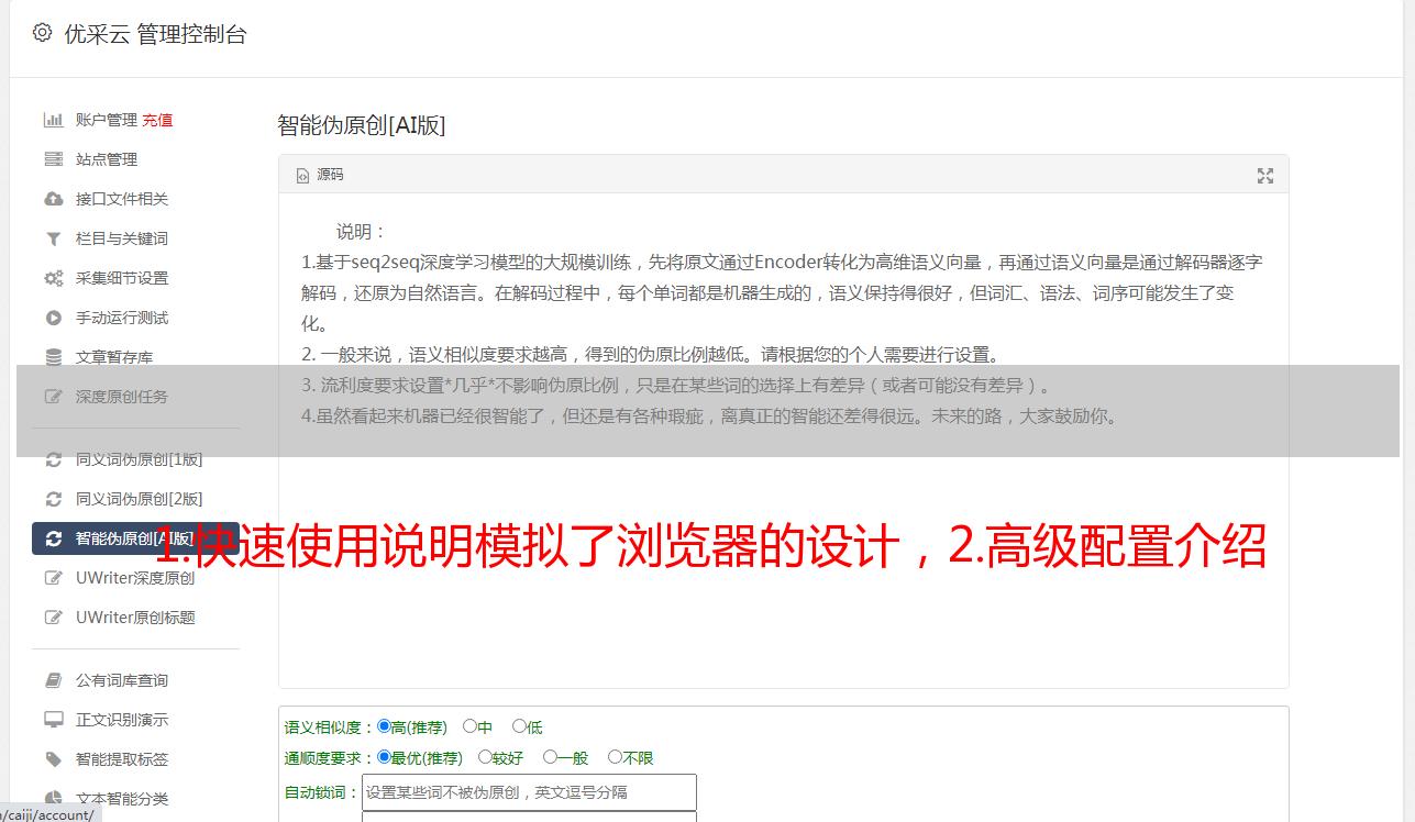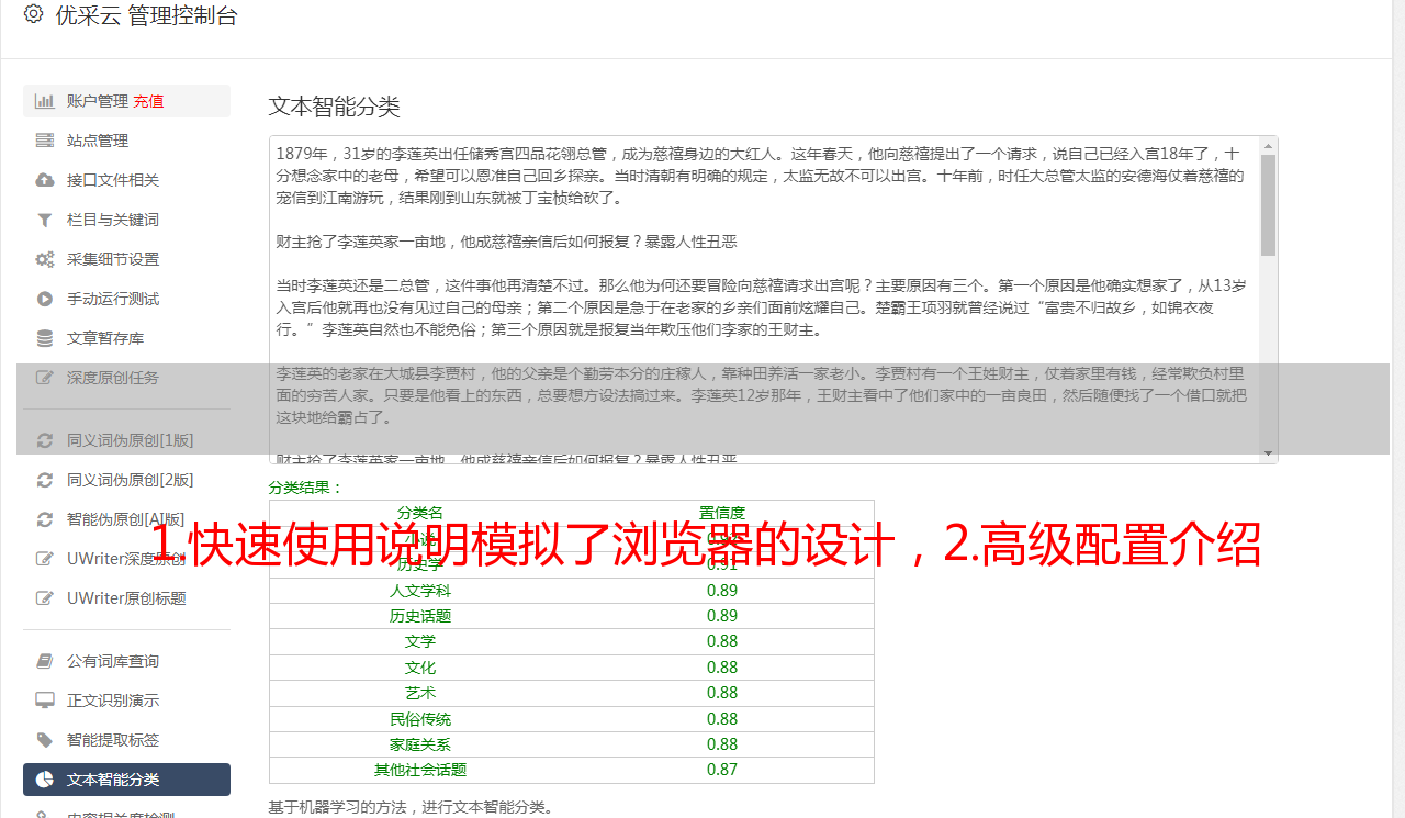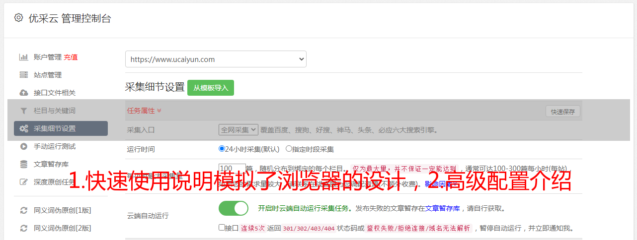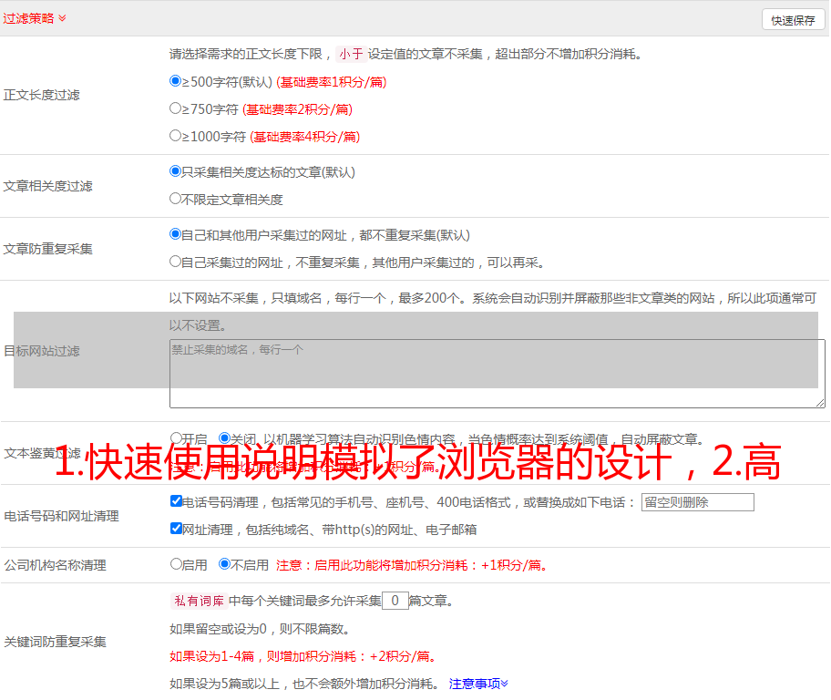 1.快速使用说明模拟了浏览器的设计,2.高级配置介绍
