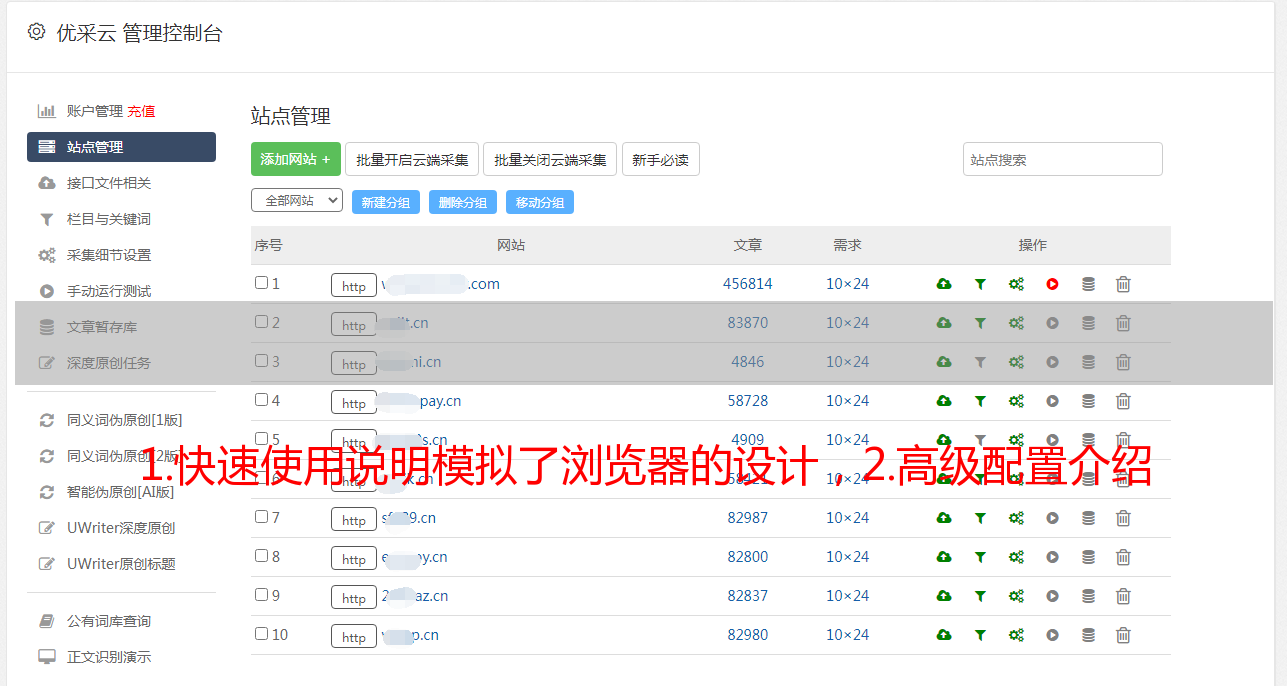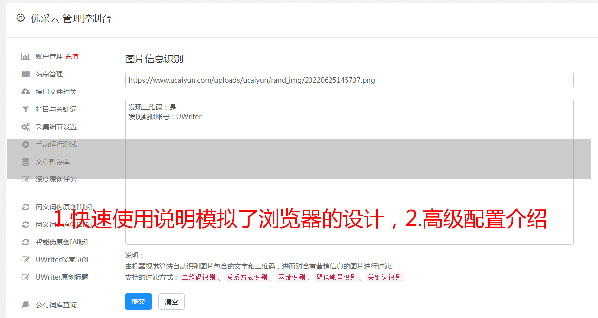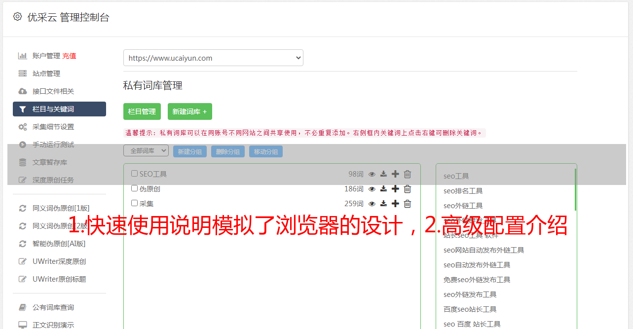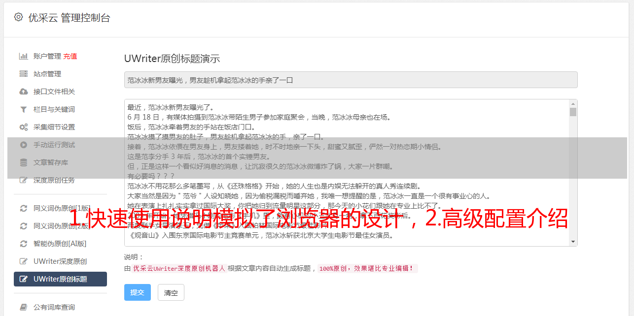 1.快速使用说明模拟了浏览器的设计,2.高级配置介绍