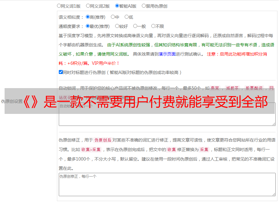 利用人工智能中的自然语言处理技术实现文章伪原创处理。核心功能包括“smart伪原创”、“同义词替换伪原创”、“反义词替换伪原创”、“用html代码在文章中随机插入关键词”、“句子打乱重组”等等等,处理后的文章原创度和收录率都在80%以上。想了解更*敏*感*词*,请下载软件试用。