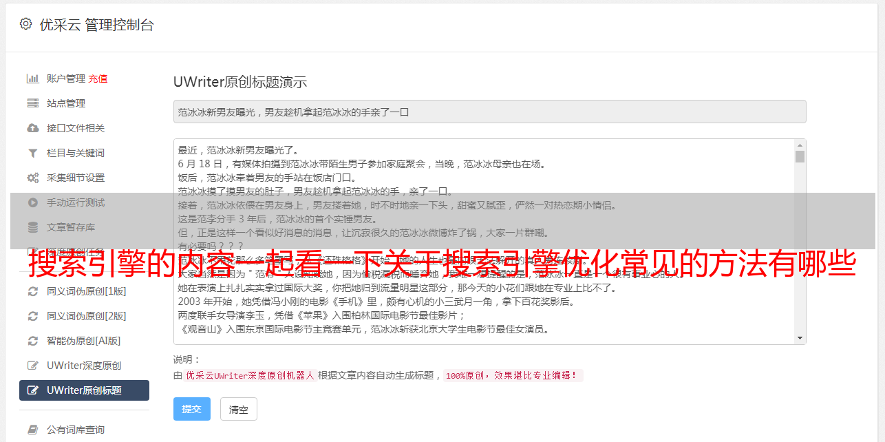 只要你想通过互联网,一键搜索就可以得到。但是,如果网站提供的内容与其他网站提供的内容大致相同,或者只是略有修改,而您没有自己独特的见解,则此类内容不会进入搜索引擎的“眼睛”。因此,搜索引擎优化必须坚持以网站话题为基础写出原创内容,并有自己独特的优势。