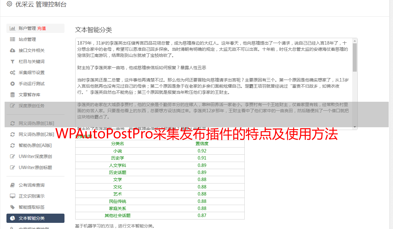4.具有完善的基本设置功能,完美支持各种wordpress功能。可自动设置分类目录、标签、摘要、特*敏*感*词*片、自定义栏目等; 采集target网站分类目录和标签也可以设置等信息后自动生成并添加相应的分类目录、标签等信息