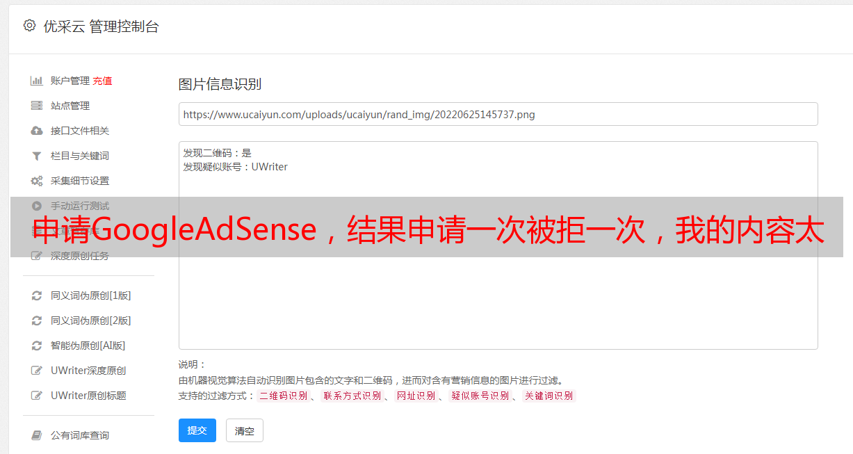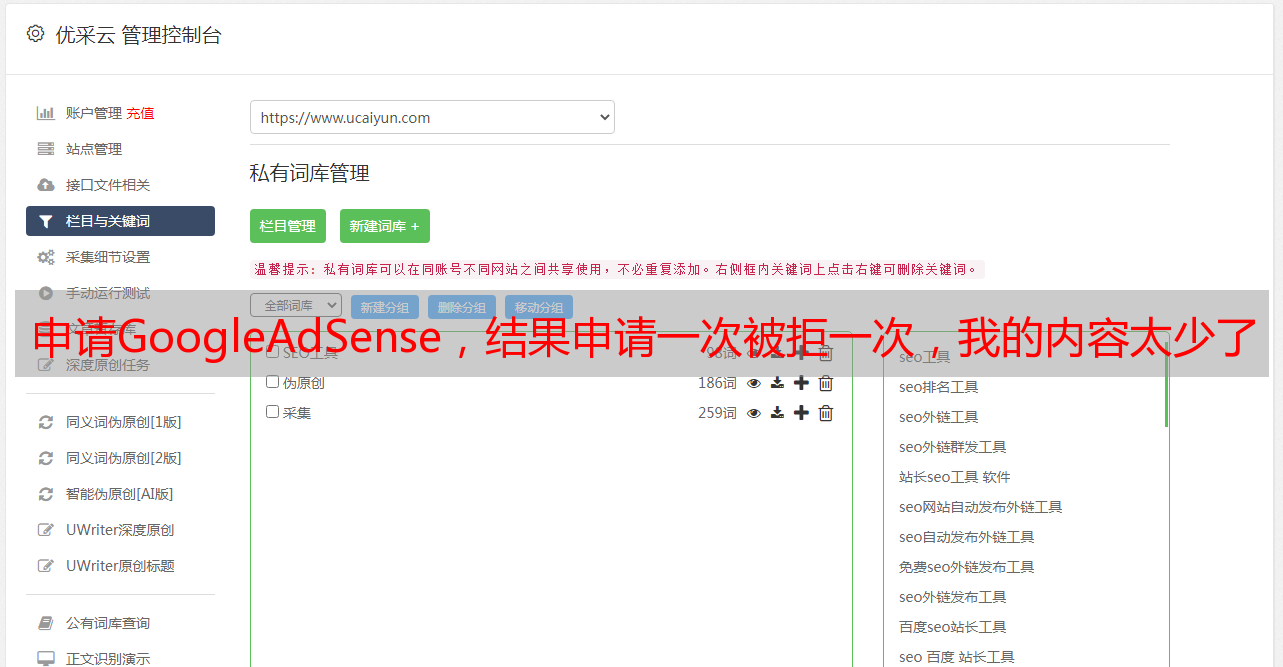 优采云 发布时间: 2021-08-26 00:11申请GoogleAdSense,结果申请一次被拒一次,我的内容太少了
