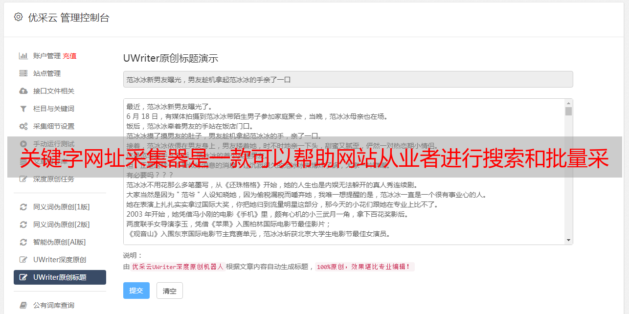 优采云 发布时间: 2021-08-27 18:16关键字网址采集器是一款可以帮助网站从业者进行搜索和批量采集的工具