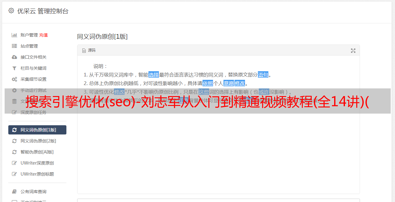 优采云 发布时间: 2021-08-28 01:16搜索引擎优化(seo)-刘志军从入门到精通视频教程(全14讲)(基本课程目录是一、SEO的基本概念和模型的优化)