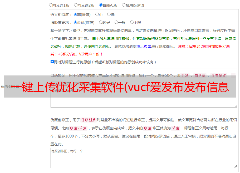 一键上传优化采集软件(vucf爱发布发布信息软件,敏感词批量替换自2016年)