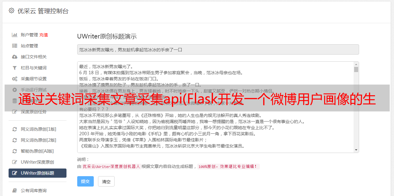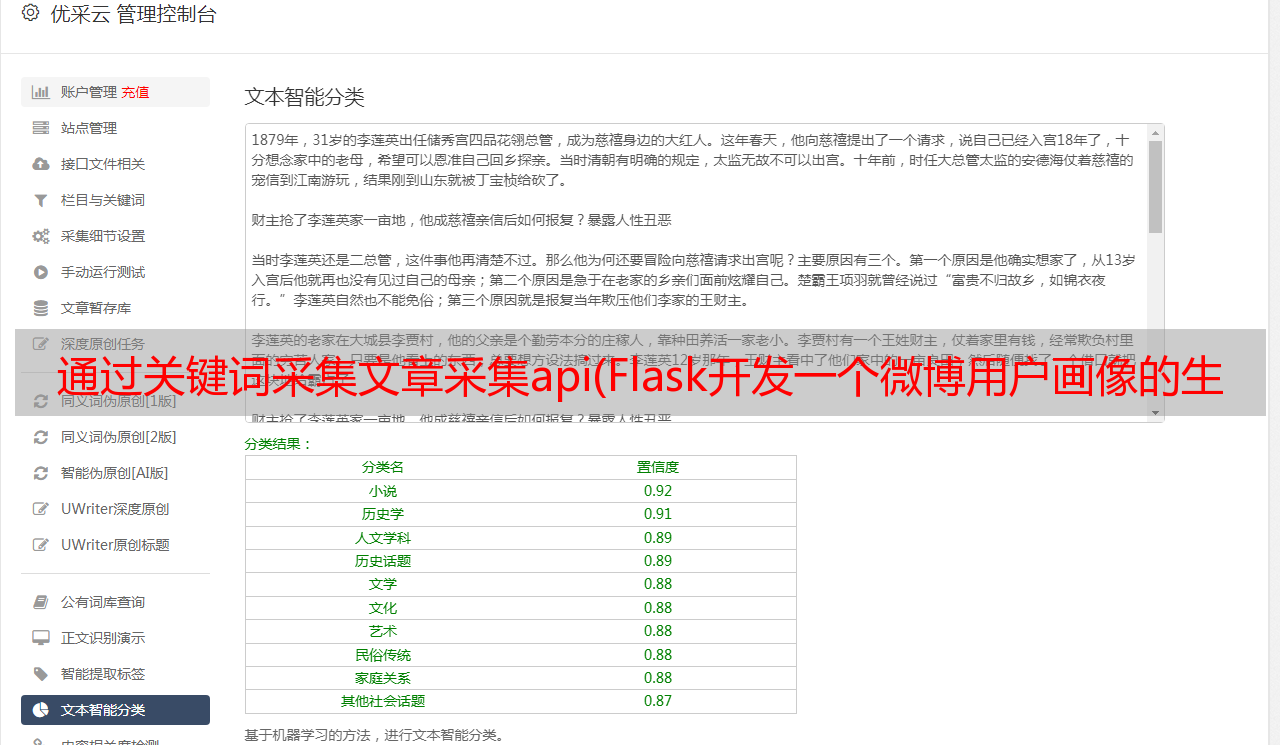 优采云 发布时间: 2021-08-29 09:11通过关键词采集文章采集api(Flask开发一个微博用户画像的*敏*感*词*开发步骤及步骤)