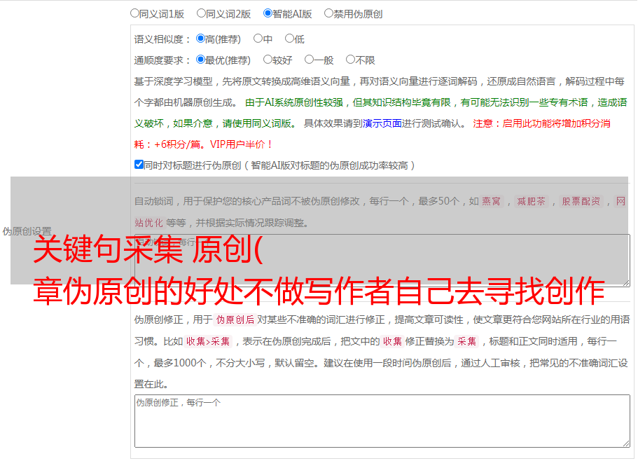 采用以上两种方式,一般是为了保证文章清洗整改后的可读性。前提是可以在不改变文章内容可读性的情况下调换部门段落的顺序。添加您自己的总结以进行过度的四个。根据替换词组句子段落的意愿,对文章的词组句子和段落进行必要的替换,不改变意愿。一般来说,用伪原创替换词组名称段落的工具有很多是可以做到的,效果比手动替换的工作要高很多,但是通过工具伪原创文章如果我们拿起来再读一遍,文章可能意思变化很大,连意思都没有表达出来。意思是如果是我们专门运营的网站,建议大家尽量不要使用tools伪原创我们手动编辑,那么可能是文章User Experience 比较理想,我们应该多从用户的观点和花费更多的时间虽然对于文章的质量来说是伪原创,但必须确保它非常令人兴奋。找同样的问题文章进行多篇文章混 这是最简单最实用的方法。这种方法可能是最常用也最有效的,但是一般多篇文章混在一起后,文章的可读性就大打折扣了。如果单纯考虑网站的收录数量,可以大批量实施。一般洪涛用的最多的就是花点时间找一些相关的文章然后发到文章与主题内容相关的remix三到五篇文章每篇文章截取1-2段,重新组合一个新文章文章被截获后,文章必须重新创作,重写。第六,寻找行业内的英文资料进行外文翻译。经常有人用翻译软件反复翻译伪原创,但作为正规网站我们不是垃圾站。为了用户体验,我们严禁直接使用纯软件翻译。 文章固然 人工翻译比较费力,不过你可以用懒惰的方法,只翻译大意或者在我们的文章加一段。也可以像这样附上它在高可读性的基础上有了很大的提升文章的原创性目前看来用这个的朋友比较多。我去年也用过收录比纯采集,效果好很多,对用户更有利。阅读7 按文章原意文章按文章本意增删 与上述方法类似,也可以在不影响整句原意的情况下,删除一些文字或单词。长话短说。不同句子的不同变化可以让这个文章更有利于搜索引擎和用户体验。